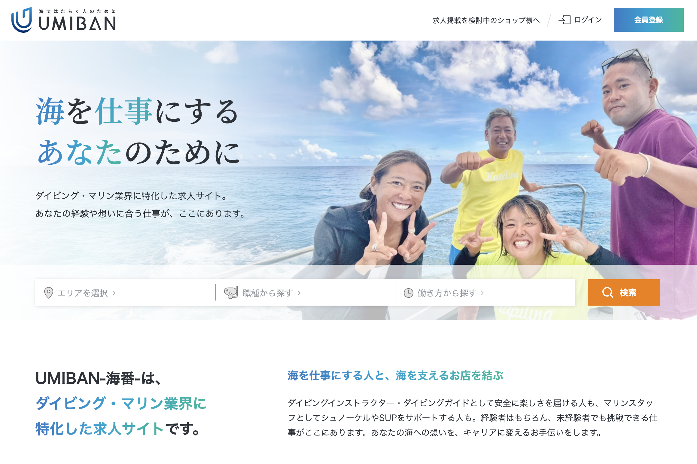 UMIBAN-海番-は、ダイビングショップ・マリンレジャー事業者の求人掲載、応募管理、人材育成などの採用業務をトータルサポートする、ダイビング・マリン業界特化の人材プラットフォームです。